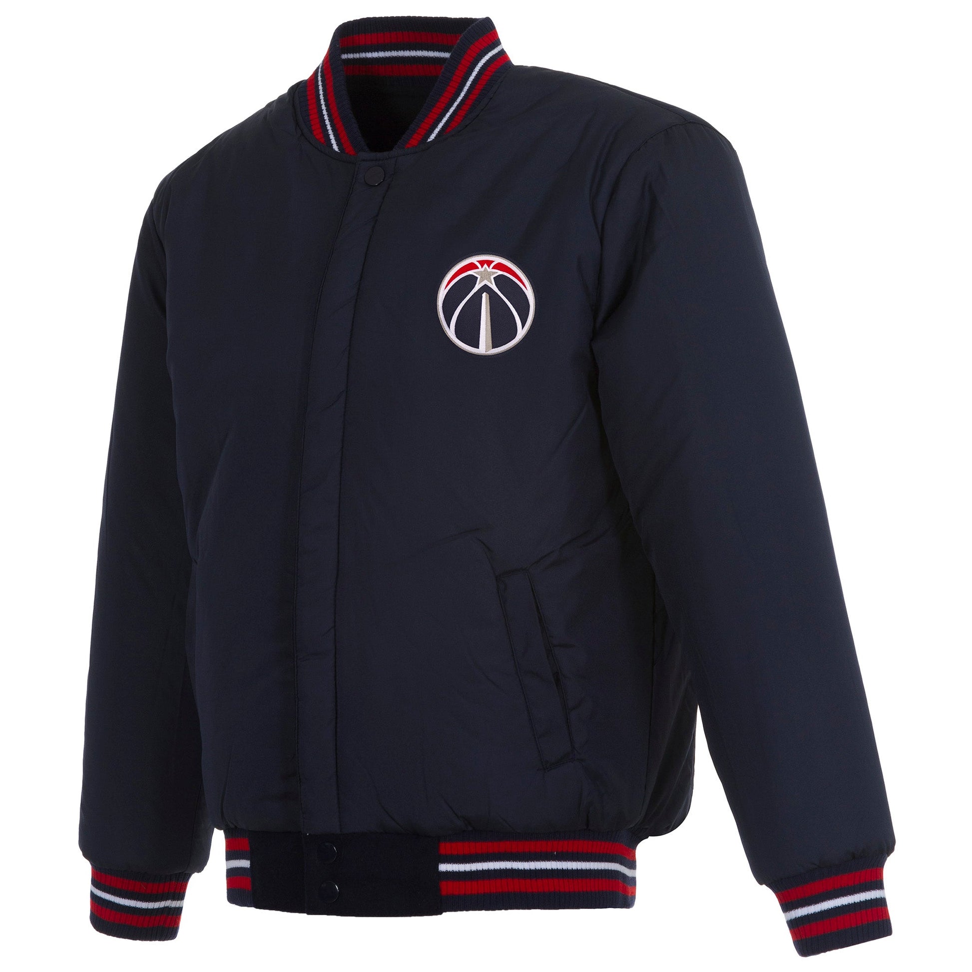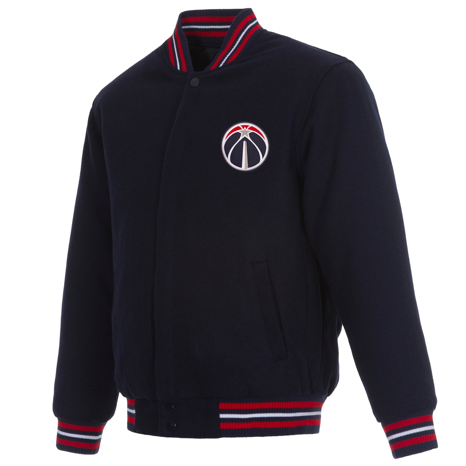 Washington Wizards All Wool Jacket with nylon lining in navy and red with embroidered logos. Assembled in the USA. 55% wool 45% polyester body. Snap button closure.