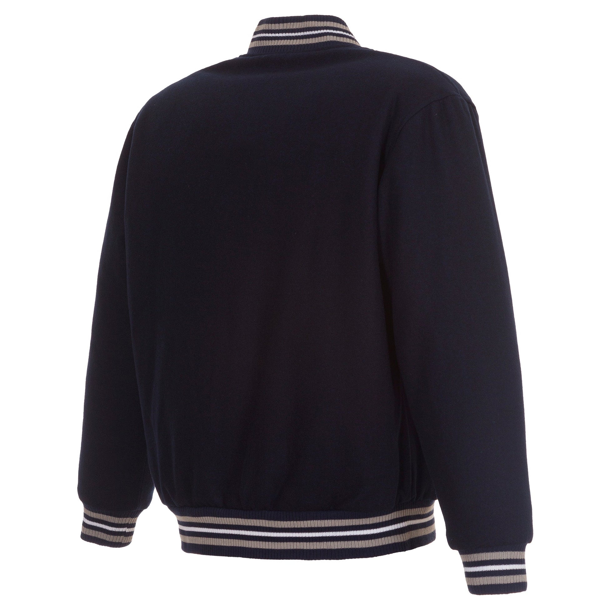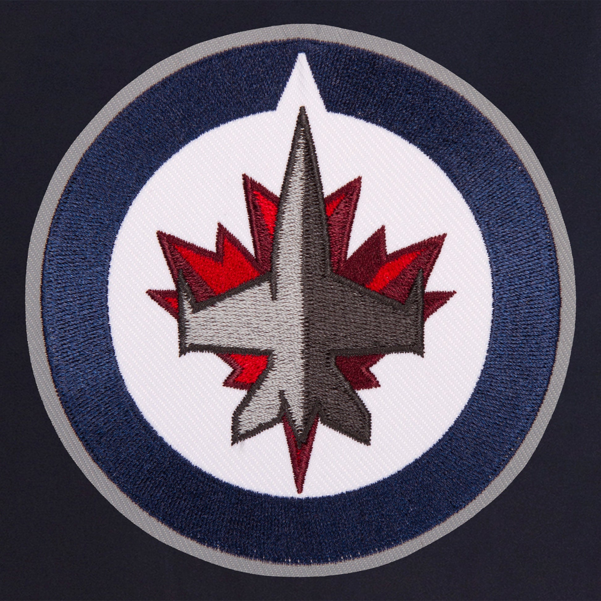 Winnipeg Jets All Wool Jacket with nylon lining in navy and grey with embroidered logos. Assembled in the USA. 55% wool 45% polyester body. Snap button closure.