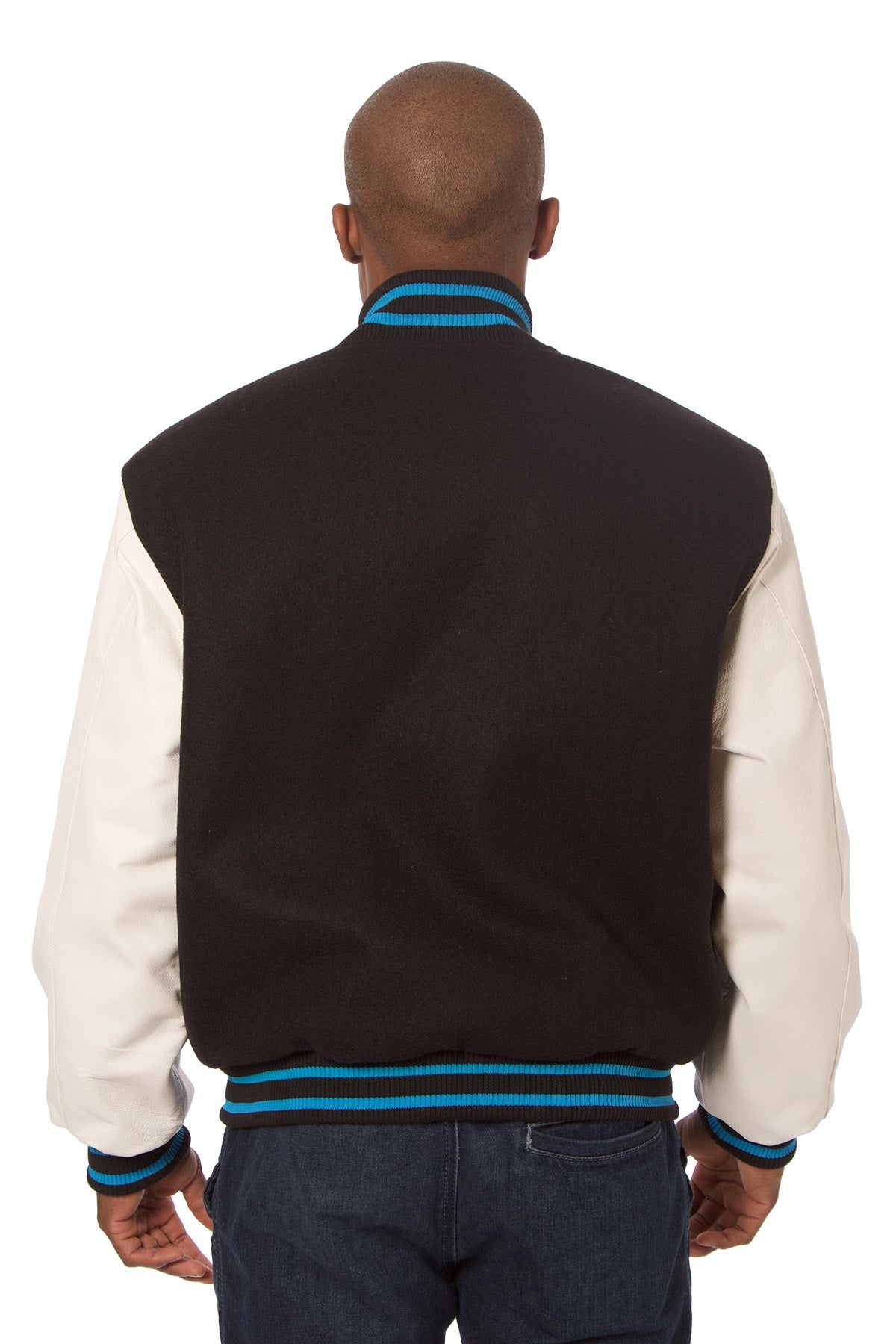 Wool and leather varsity jacket in black and white with black and Carolina blue ribbing.