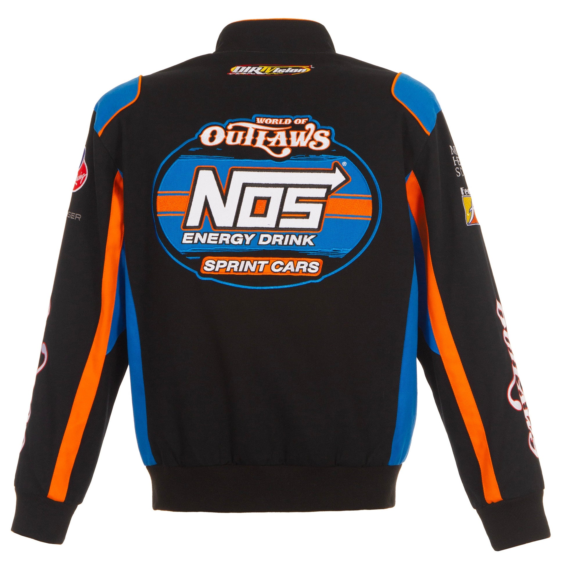 World of Outlaws Twill Jacket in black with embroidered appliqué logos. Snap front enclosure