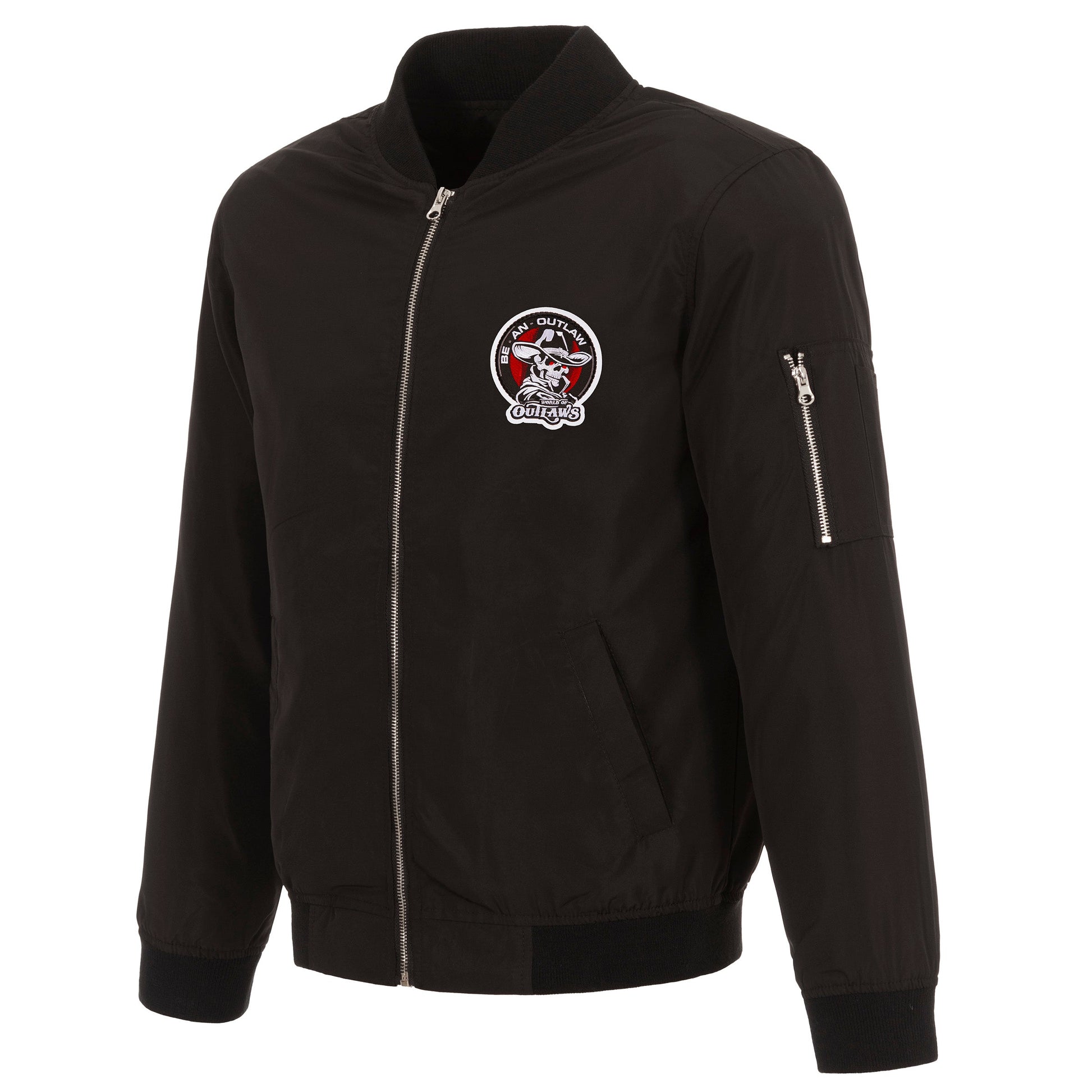World of Outlaws nylon bomber in black with embroidered logos. Assembled in the USA. 100% Nylon, full length zip front.