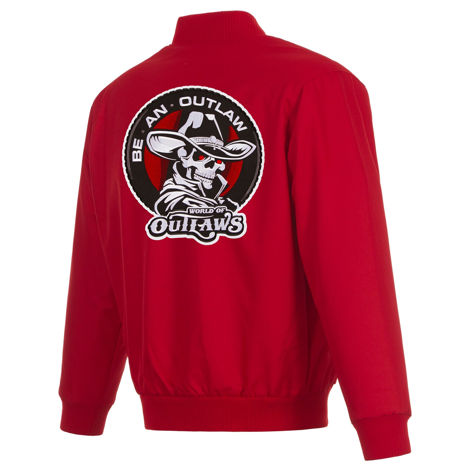 World of Outlaws Poly-Twill Jacket with quilted nylon lining in red with embroidered logos. Assembled in the USA. 100% polyester body. Snap button closure
