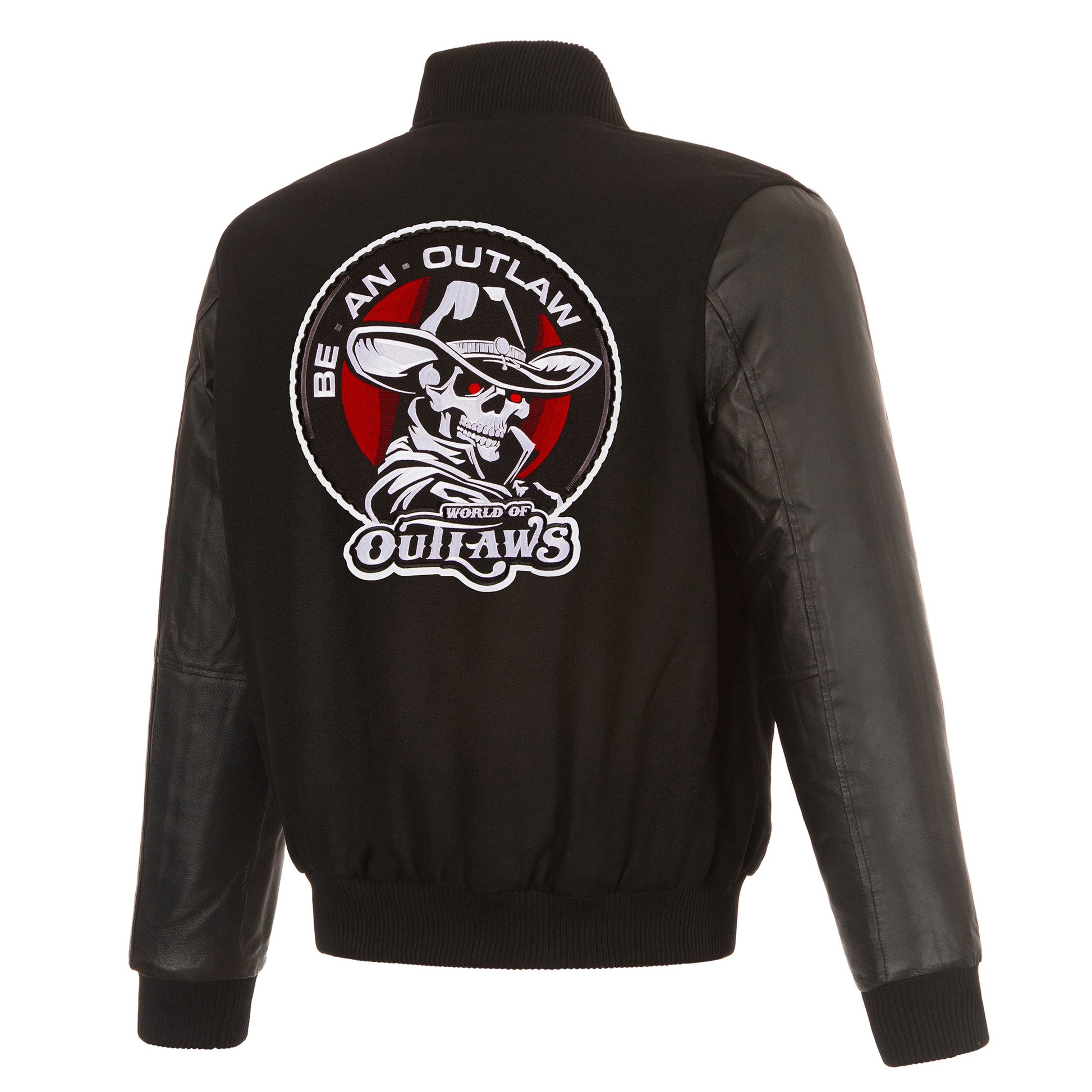 World of Outlaws Reversible Wool and Leather Jacket with quilted nylon lining in black with embroidered logos. Assembled in the USA. 55% Wool 45% polyester body, 100% leather sleeves. Snap button closure.